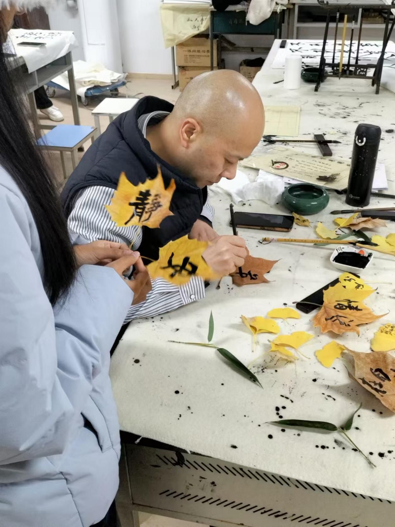 秋意渐浓时,协会率先发起“落叶书法练习”活动。社员们走进校园绿化带,拾取形态各异的落叶作为天然“宣纸”,以软笔蘸取墨汁。金黄的银杏叶、泛红的枫叶上,楷、行、隶等多种书体相映成趣,既降低了书法练习的材料成本,又让大家在亲近自然中感受笔墨韵味,成为校园里一道独特的文化风景线。