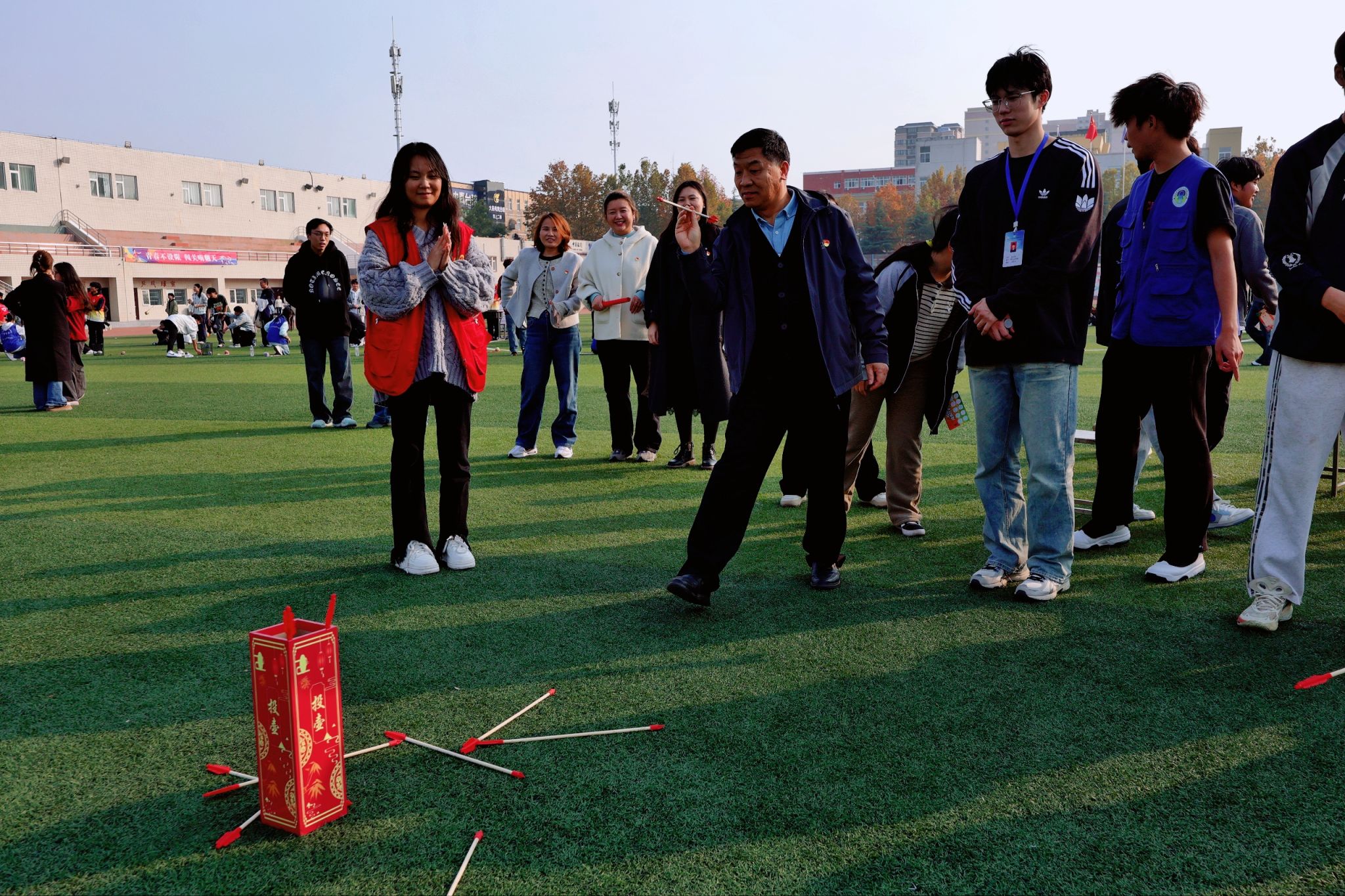 活动现场,射箭、投壶、跳绳、踢毽子、足球射门等十大趣味关卡依次排开,大家精神抖擞、奋勇争先,每一个参与瞬间都彰显着昂扬向上、锐意进取的精神风貌。射箭竞技中,大家凝神聚力、精准瞄准,展现出沉稳专注的风采;传统投壶前,学子们屏气凝神、轻投慢放,在古雅趣味中感受传统文化魅力;极速跳绳、花式踢毽子赛场,学生们身轻如燕、节奏明快,飞扬的身影勾勒出青春律动。