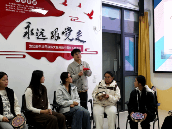 在活动核心环节——“室内奥尔夫”音乐体验中,同学们自主选择心仪乐器,在老师指导下迅速掌握基础演奏方法。大家结合自身心情状态,将情绪融入乐器演奏,以乐寄情,用旋律传递内心感受。活动现场不同乐器交织奏响,音色丰富,情绪多元。其余同学认真聆听,用心捕捉演奏者的情绪与想法,在互动交流中进一步加深了彼此的理解与信任。