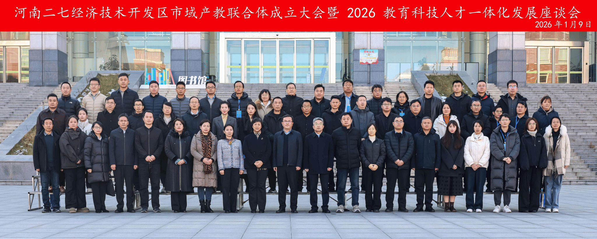 1月9日,在河南省教育厅和中共二七区委组织部人才工作领导小组办公室指导下,由二七经济技术开发区、河南建筑职业技术学院、郑州新大方重工科技有限公司牵头,联合郑州市二七区相关政府部门、企业、院校、科研机构、行业组织共同组建的河南二七经济技术开发区市域产教联合体,在我校召开“才聚二七 智创未来”——河南二七经济技术开发区市域产教联合体成立大会暨2026教育科技人才一体化发展座谈会。