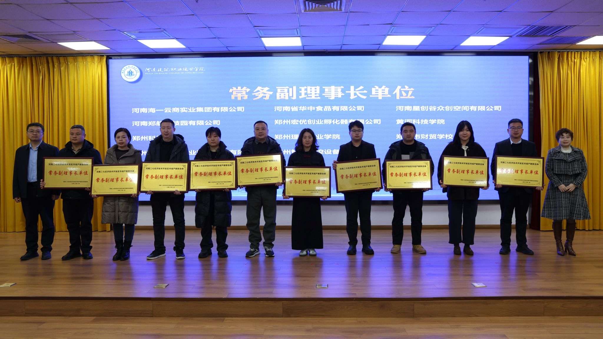 大会集体审议并表决通过了河南二七经济技术开发区市域产教联合体章程和组织机构名单。河南省教育厅领导、郑州市、二七区领导以及牵头单位领导分别为联合体理事长单位、常务副理事长单位、副理事长单位授牌。会上,副校长赵肖丹代表河南建筑职业技术学院与郑州一建集团有限公司、郑州投控科技产业园区发展有限公司、郑州市筑建职业技能培训学校有限公司举行了校企合作签约仪式。