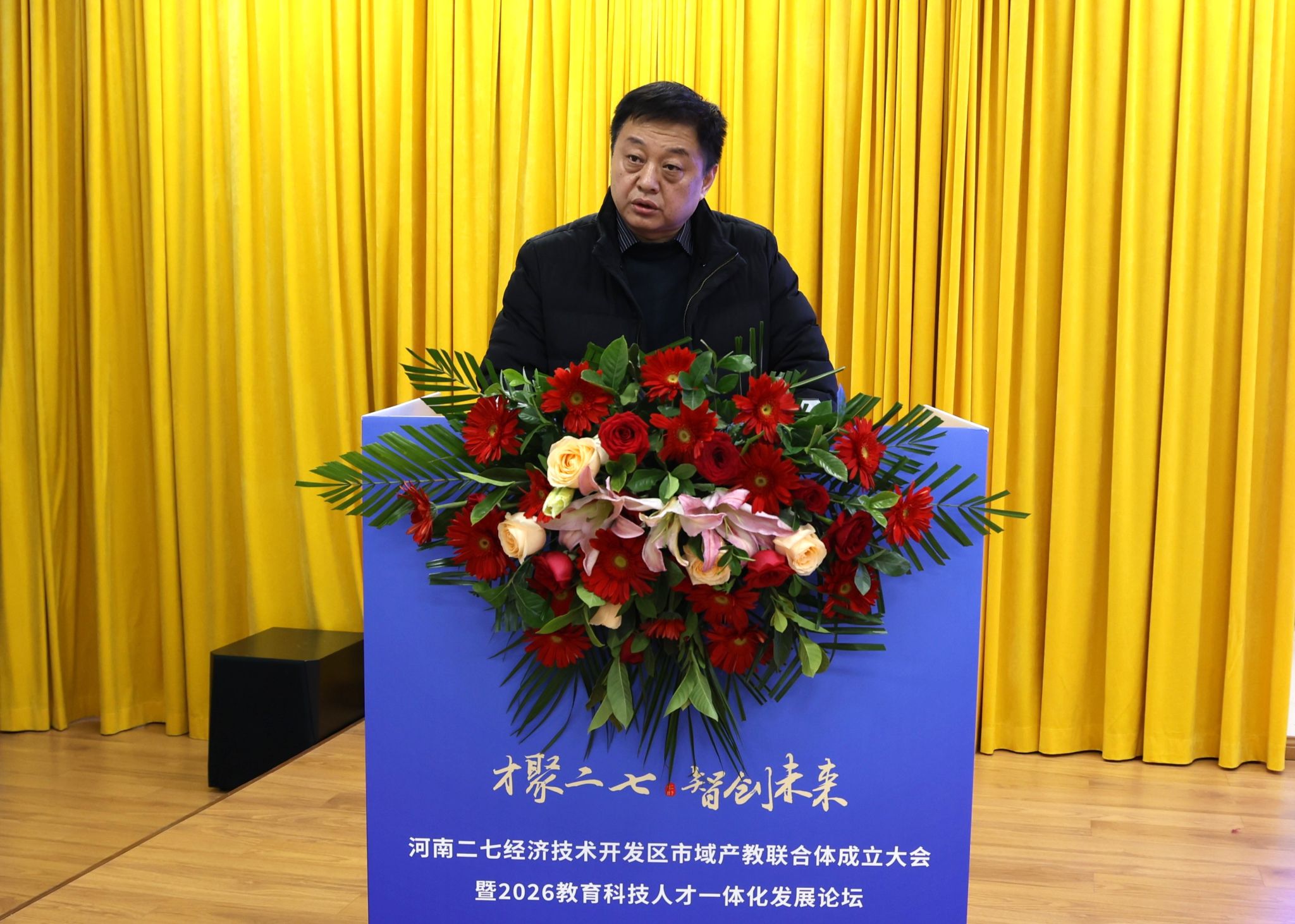 河南建筑职业技术学院党委书记梅杨代表学校对参会的领导和嘉宾表示热烈欢迎。他指出,党的二十届四中全会提出统筹教育、科技、人才强国建设,构建“政产学研用”融合创新联合体;省委十一届十次全会锚定科教强省目标,以“1+2+4+N”体系为牵引推进建设,为政行校企协同育人搭建了广阔平台。作为牵头单位,学校将以联合体成立为契机,立足办学积淀与专业优势,深度对接二七经开区产业布局,与成员单位同心聚力、同频共振,书写职业教育赋能区域经济高质量发展崭新篇章。