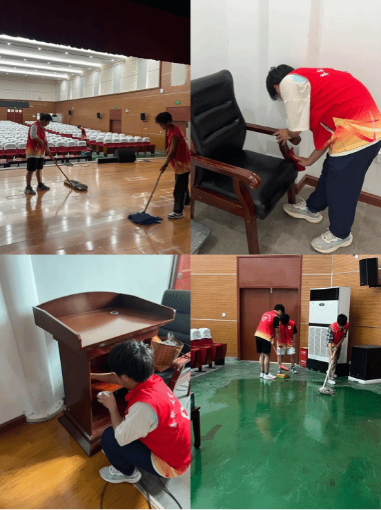 活动现场,同学们在胡会丽老师引导下迅速分组,明确分工,有条不紊地开展大礼堂卫生打扫工作。同学们热情高涨,手持扫帚、抹布等清洁工具,分组对大礼堂的地面、墙面、舞台、化妆间等区域进行全面清扫。有的同学踮起脚尖擦拭高处的灰尘,有的弯腰细致清理墙角的垃圾,即使汗水浸湿了衣衫,脸上却始终洋溢着劳动的喜悦。
